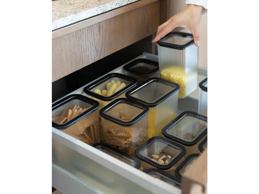 Minimalistický nadčasový design dózy Neroli přináší do kuchyně estetiku a funkčnost. Kombinace nádob z této řady umožňují maximální využití prostoru ve skříňkách a zásuvkách a zároveň zajišťují pořádek a stylový vzhled. Dóza je vyrobena z kvalitního, zdravotně nezávadného plastu bez obsahu ftalátů a BPA. Nádoba ušlechtilého vzhledu je zdobena originálně vypadajícími rýhami. Je vybavena těsně přiléhajícím průhledným víkem, které umožňuje kontrolu obsahu. Černý, pružný, těsnící rám dodává výrobku charakter, eleganci a klasický vzhled.