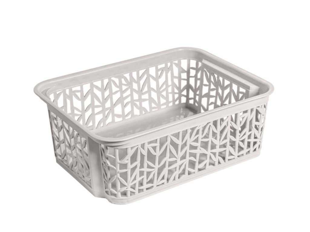 Plastový košík originálního vzhledu s motivem bambusových větviček a listů. Bambusové koše se tak stanou ozdobou Vaší domácnosti. Konstrukce košů umožňuje jejich stohování jeden na druhého díky speciálně navrženým hranám po stranách. Košík je perfektním řešením pro udržení pořádku v kuchyni, koupelně, dětském pokoji. Rozměry: 23,5cm x 17,7cm x 8,5cm. Barevné provedení - antická bílá.