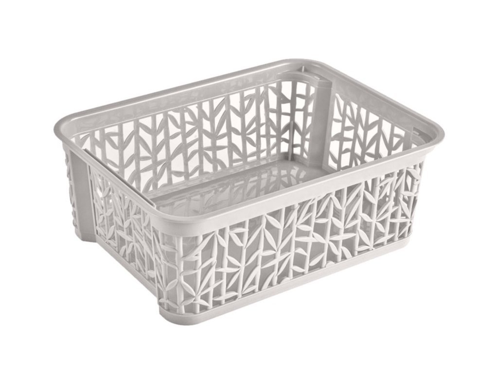 Plastový košík originálního vzhledu s motivem bambusových větviček a listů. Bambusové koše se tak stanou ozdobou Vaší domácnosti. Konstrukce košů umožňuje jejich stohování jeden na druhého díky speciálně navrženým hranám po stranách. Košík je perfektním řešením pro udržení pořádku v kuchyni, koupelně, dětském pokoji. Rozměry: 39,4cm x 27,2cm x 16,5cm. Barevné provedení - antická bílá.