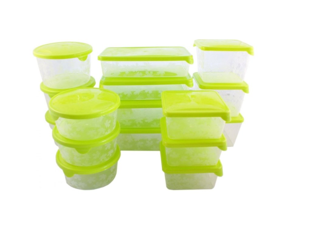 Sada víceúčelových dóz na potraviny s barevným víčkem. Svěží moderní design s motivem lístků. Kombinace dóz - 4x obdelník, 6x kulatá, 7x čtverec. Vhodné do mrazničky, mikrovlnné trouby (bez víčka). (4x0,45l + 3x0,75 l + 2x0,9l + 2x1,35l + 3x0,45l + 3x0,75l )