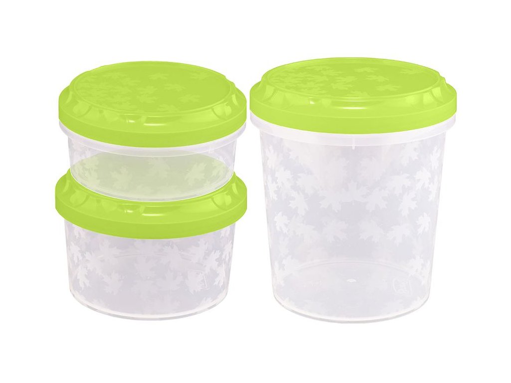 Sada dóz na potraviny se závitem Rukkola -kulatá, o objemu 0,375l, 0,6l a 1l. Ergonomicky tvarované víko pro snadné uchopení Barvy: fialová, zelená. Svěží moderní design, praktické využití v kuchyn