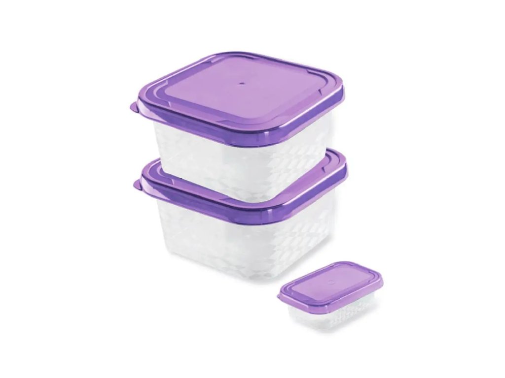 Multifunkční boxy série ORI jsou ideální pro skladování potravin v lednici i v kuchyňské skříňce na polici. Minimalistické nadčasové dekorace dodávají kouzlo a jemně skryjí obsah nádoby. Výhodou jsou také víčka v moderní fialové barvě. Sada boxů je vyrobena z kvalitního, zdravotně nezávadného plastu bez obsahu ftalátů a BPA. Potraviny v nich uložené lze zmrazit, případně ohřát v mikrovlnné troubě (bez víka). Mytí v myčce. Sada obsahuje 3 ks dóz o objemu 1 x 0,1 l, 2 x 1,25 l.