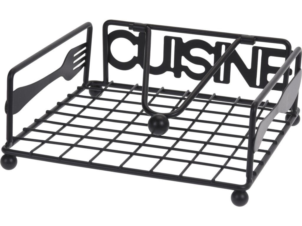 Pevná kovová konstrukce činí produkt odolný a má dlouhou životnost. Držák na ubrousky má velice zajímavý design v klasické černé barvě se bude hodit do každého interiéru. Rozměry: 18 x 18 x 6 cm. Moderní držák na ubrousky je spojením praktických a estetických funkcí v tom nejlepším provedení! Drátěný držák na ubrousky Cuisine najde své místo na stole v obývacím pokoji, na kuchyňském stole nebo v jídelně. Díky němu budou ubrousky vždy po ruce během jídla nebo přestávky na kávu. Navíc, držák na ubrousky je navíc zajímavým doplňkem. Jeho jednoduchý a nadčasový tvar upoutá pozornost. Umístěte do ní jednorázové papírové ubrousky. Vyberte si jednobarevné nebo s krásným vzorem odpovídajícím příležitosti nebo ročnímu období.