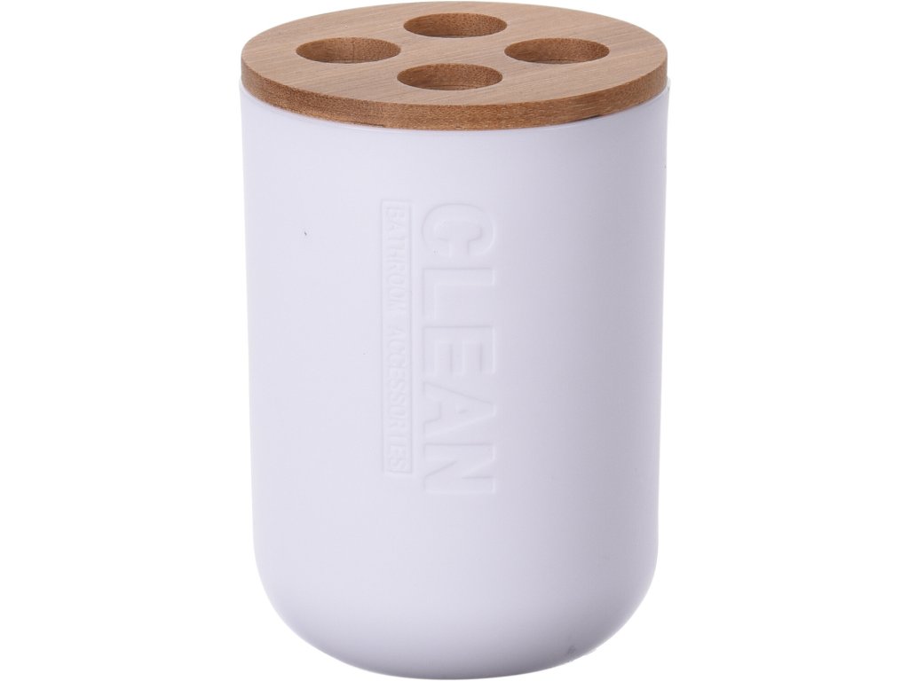 Držák na zubní kartáčky vyrobený v kombinaci bílého plastu a přírodního bambusového dřeva. Odnímatelné víko se čtyřmi otvory umožňuje snadné čištění nádobky. Elegantní design vhodný do koupelny.