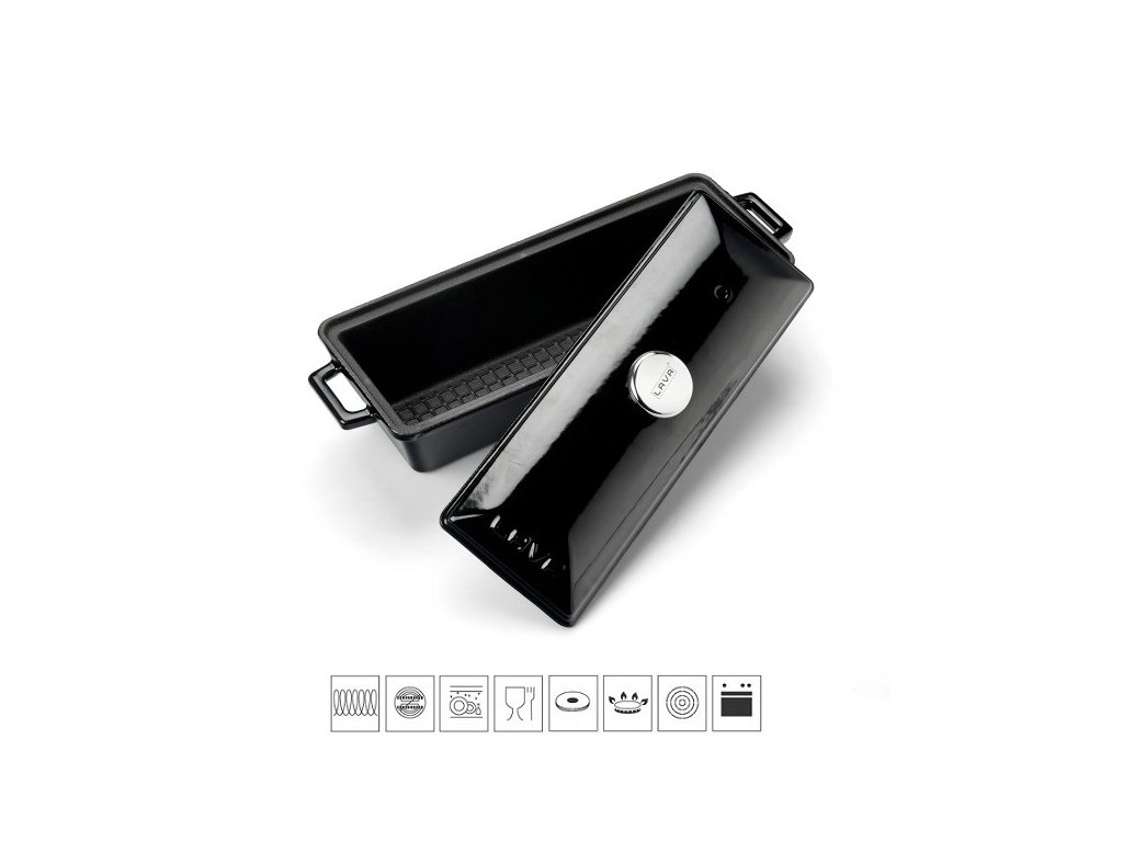 Teriny Lava metal jsou vyrobeny z masivní smaltované litiny s nepřilnavým povrchem. Jsou vhodné pro použití v troubě, připravit v nich můžete buchty nebo pomalu péct maso, skvělé jsou na přípravu domácí paštiky nebo krásně voňavého chleba. Jednoduše multifunkční pomocník. Díky praktickému tvaru a velikosti můžete terinu použít i pro přípravu sladkých dezertů. Ucha po stranách formy usnadňují manipulaci a servírování. Černá s barevně sladěnou poklicí, která je opatřena nerezovým úchytem, má vnitřní rozměry 11x29 cm. Celková délka s úchyty je 33 cm, výška s poklicí 10,8 cm. Mytí v myčce nedoporučujeme, po použití umyjte horkou mýdlovou vodou a otřete dosucha.