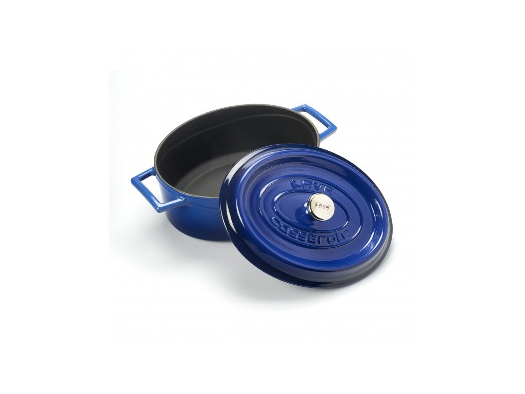 Oválný litinový hrnec značky LAVA s kvalitním lesklým modrým smaltem na povrchu Vás zaujme designem a výdrží. Hrnec má objem 4,7 l, průměr 29 cm, šířku 23 cm a výšku 12 cm. Litina skvěle vede a akumuluje teplo. Těžká poklice dobře těsní a pomáhá držet teplo a vlhkost uvnitř hrnce. Vnitřní strana hrnce je opatřena nepřilnavým povrchem a vnější modrý smalt je odolný vůči popraskání, oděru a vysokým teplotám. Díky svým jasným barvám se hrnec stane ozdobou Vaší kuchyně.