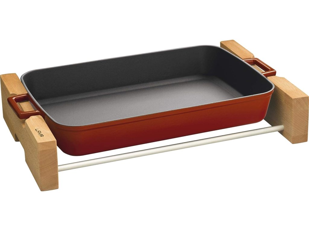 LAVA METAL Litinový pekáč 26x40 cm s dřevěným podstavcem - červený