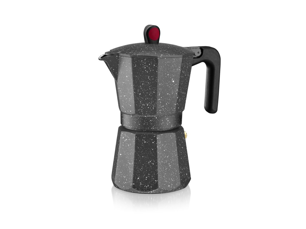 Moka konvička Rock Induction od výrobce Monix na přípravu 9-ti šálků kávy. Je vyrobena z kvalitního hliníku a povrchově upravena, tak aby imitovala povrch kamene. Červené prvky ergonomické rukojeti a úchytu víka pěkně ladí. Hliníkové moka konvičky jsou velice vyhledávané z důvodu, tvoření vrstvičky na povrchu varné nádobky tzv. patin, která ovlivňuje chuť výsledné kávy.