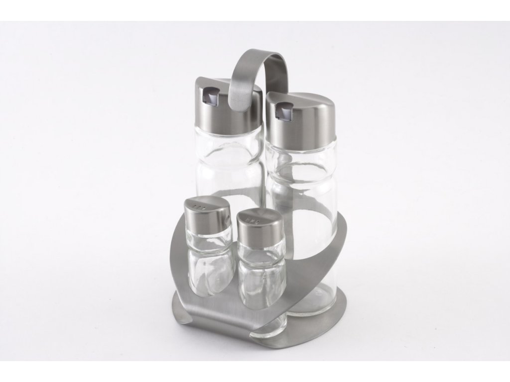 Čtyřdílná stolní dochucovací souprava. Vhodná pro domácnosti i gastronomická zařízení. Vyrobena z kvalitní nerezavějící oceli a skla. Výška stojanu 19 cm, výška nádobek na olej a ocet 16 cm, výška solničky a pepřenky 9 cm.