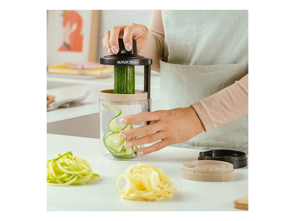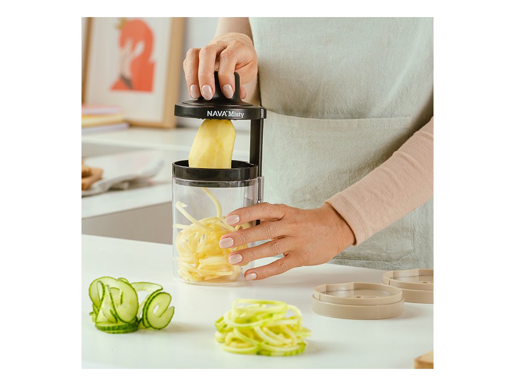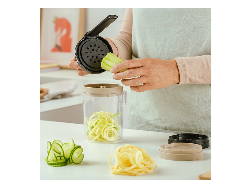 První čepel použijte k vytvoření tenkých plátků ve spirálách , zatímco druhá a třetí čepel nakrájí zeleninu na tenké proužky ve dvou různých velikostech.