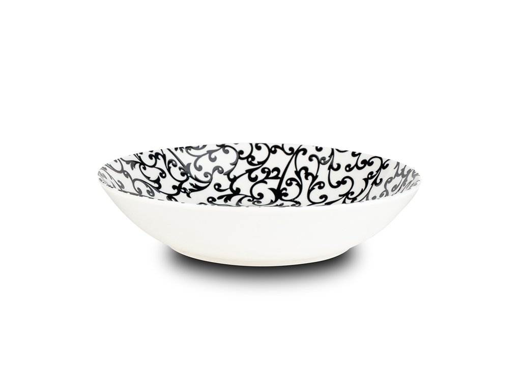 Je vyroben z kvalitního porcelánu. Má krásný moderní dekor v černé barvě, stane se tak ozdobou Vašeho stolu nejen ve svátečních chvílích, ale také při každodenním použití. Ideální je nakombinovat jej spolu s dalším nádobím stejného dekoru. Vynikající pro servírování domácích polévek, vývarů, krémů. Talíř lze použít také k podávání vloček, jogurtů, ovoce, salátů nebo přesnídávek. Snadné mytí, vhodný do myčky i k použití v mikrovlnné troubě.